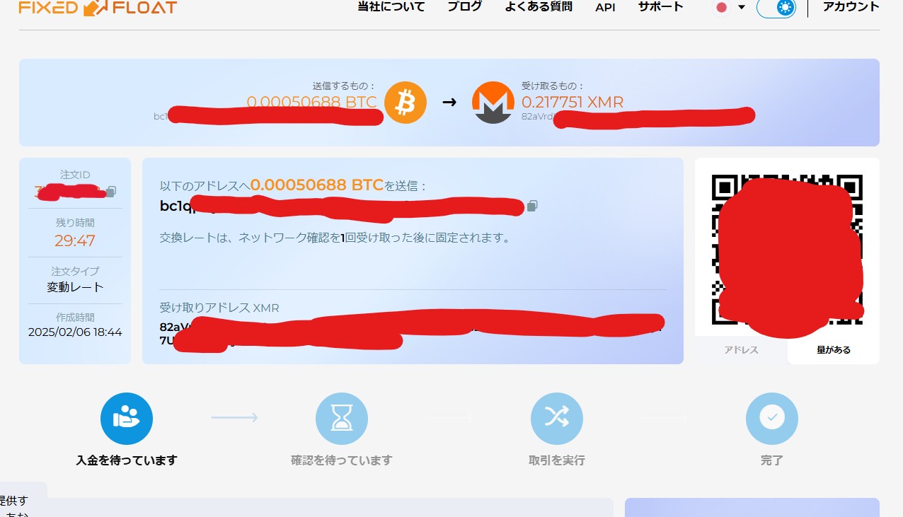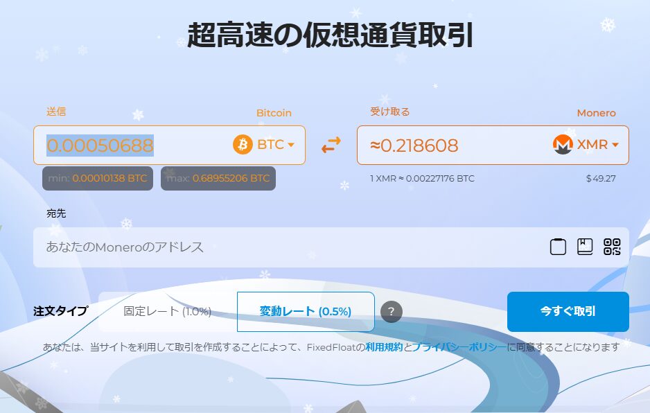 この時点で、十分な匿名性が確保されているので、FixedFloatを使ってXMR→BTCに戻しても大丈夫です。