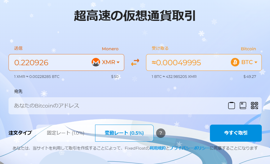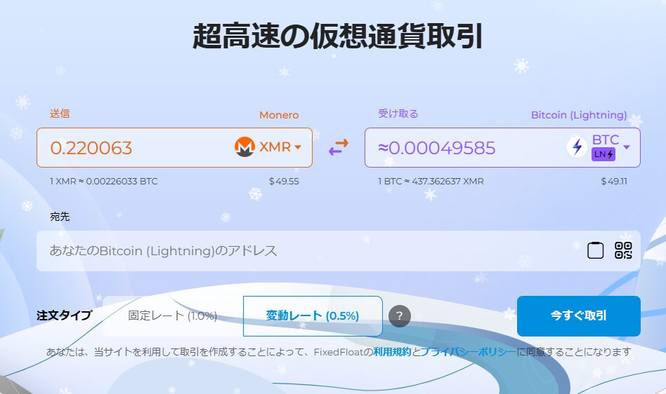 ここでコピーしたアドレスを、FixedFloatに貼り付けて、モネロからビットコイン(ライトニング)に変換します。
