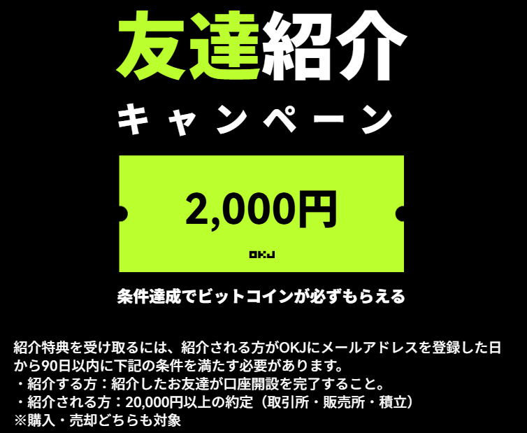 OKJでは、口座開設+20,000円入金で2,000円分のビットコイン がもらえるキャンペーンを実施中です。